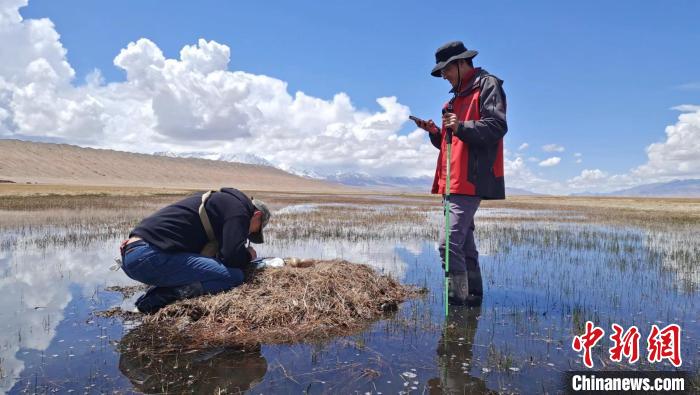 圖為楊巨才(右)在甘肅酒泉市肅北縣黨河濕地開展黑頸鶴巢位監(jiān)測工作。(資料圖) 受訪者供圖