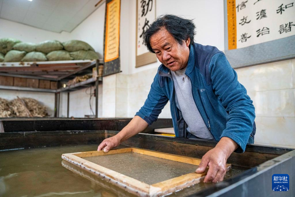在西藏米林市羌納鄉(xiāng)西嘎門巴村,南迦巴瓦童螺嘎布工藝品農(nóng)民專業(yè)合作社的工作人員正在制作藏紙(7月26日攝)。新華社記者 孫非 攝 ??