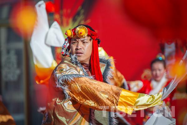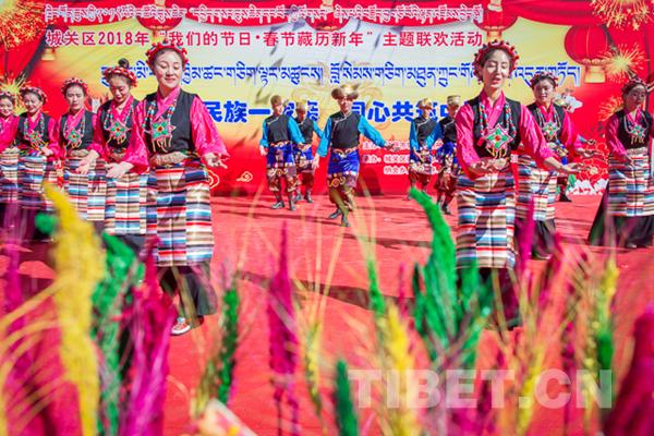 中國西藏網(wǎng)訊 2月8日上午,拉薩市城關區(qū)藏熱社區(qū)張燈結(jié)彩,彩旗飄揚,2018年“我們的節(jié)日o春節(jié)藏歷新年”主題聯(lián)歡活動拉開帷幕,來自城關區(qū)的雪巴拉姆民間藝術團、娘熱拉姆民間藝術團、阿壩林老年文藝隊的演員們?yōu)楦髯迦罕妿砹艘粓鲆暵犑⒀纭?/p>
