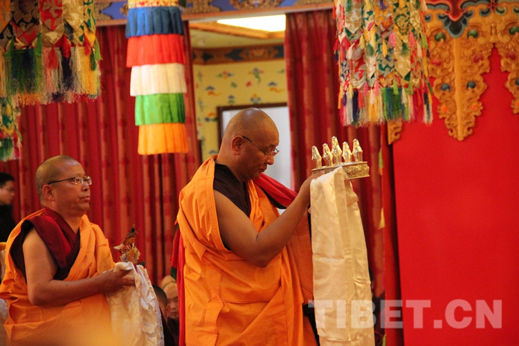 圖為土多申格副院長帶領(lǐng)經(jīng)師代表和學(xué)員代表,虔誠地向十一世班禪敬獻曼扎、佛像、佛塔、佛經(jīng)。攝影:孫健