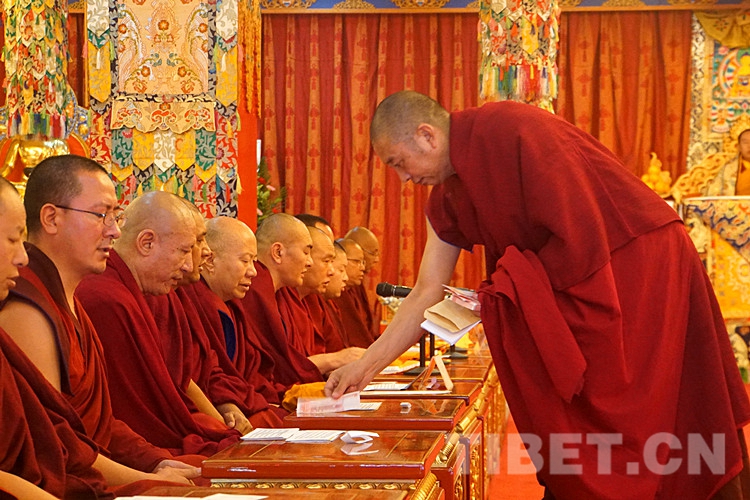 誦經(jīng)結(jié)束后,土多申格副院長帶領(lǐng)3名經(jīng)師代表和3名學(xué)員代表,虔誠地向十一世班禪敬獻曼扎、佛像、佛塔、佛經(jīng),進行佛事禮拜。班禪微笑接過供奉,為他們摸頂賜福。