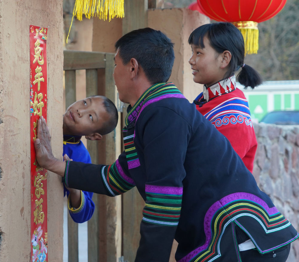 2023年1月13日,在四川省涼山彝族自治州三河村的新居,吉好有果(右一)和家人一起貼春聯(lián)。新華社記者尹恒 攝