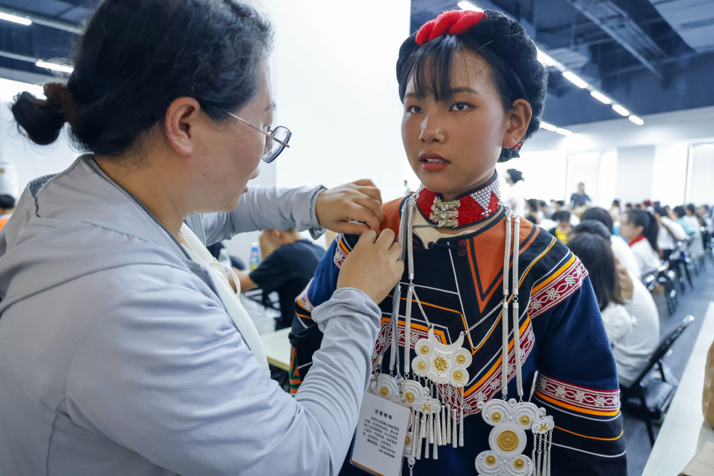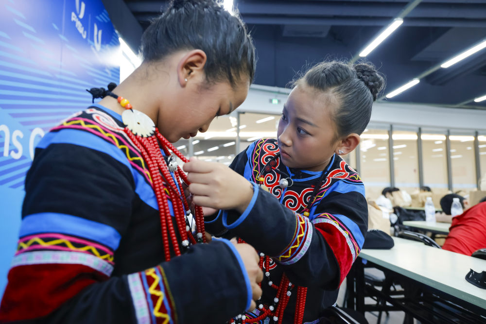 7月23日,在成都大運會開幕式彩排之前,吉合拉作(右)幫助俄地惹漢整理飾品。新華社記者沈伯韓 攝