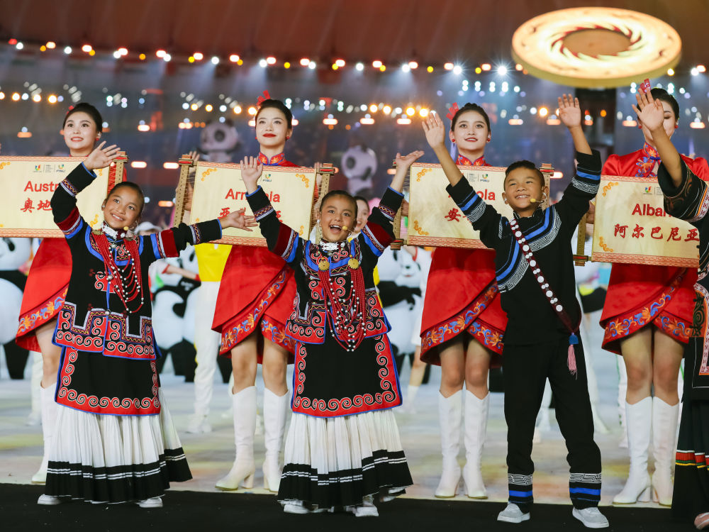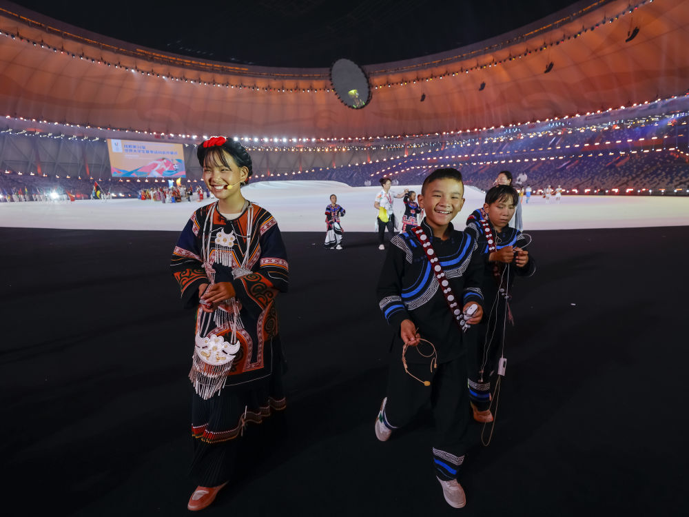 7月28日,來自四川涼山彝族自治州的孩子們在成都大運會開幕式上歌唱。新華社記者 江宏景 攝