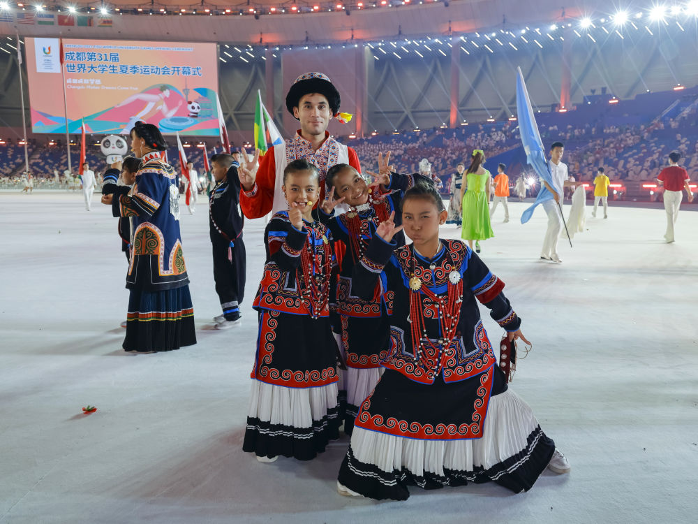 7月23日,在成都大運會開幕式彩排結束后,俄地惹漢、馬杰英和吉和拉作(前左至右)與來自新疆的塔吉克族演員拍攝合影。新華社記者沈伯韓 攝