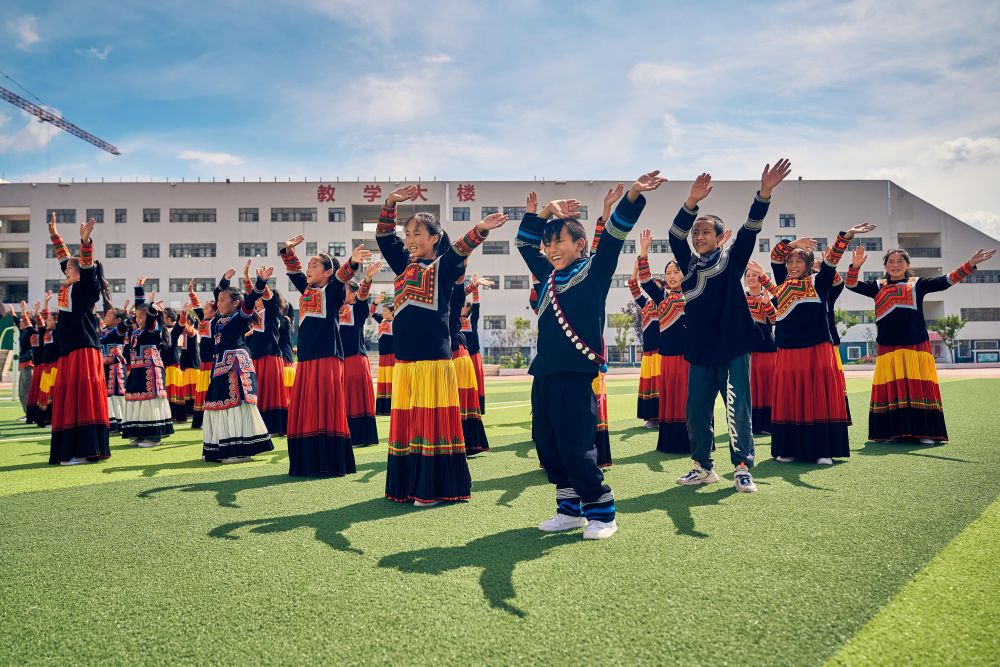 7月2日,昭覺縣萬達融創(chuàng)紅絲帶愛心學校晨曦藝術團成員在學校排練,右四為吉朵史拉。(受訪者供圖)