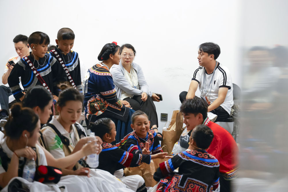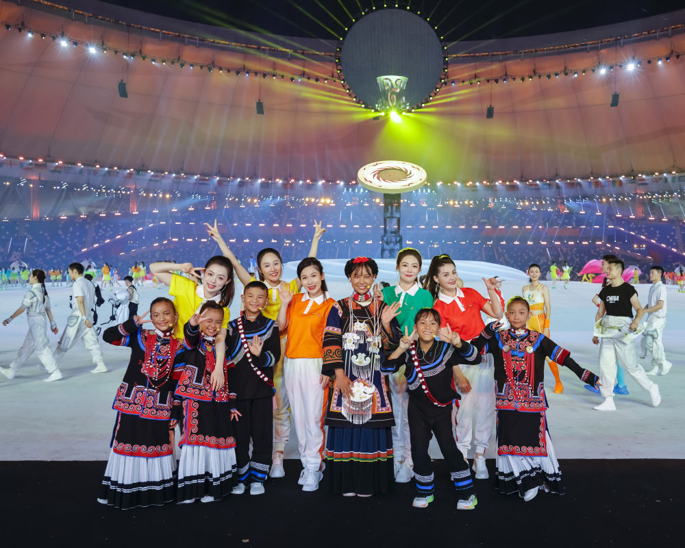 7月23日,成都大運會開幕式彩排結束后,一些演員主動和來自大涼山的孩子們拍攝合影。新華社記者 沈伯韓 攝