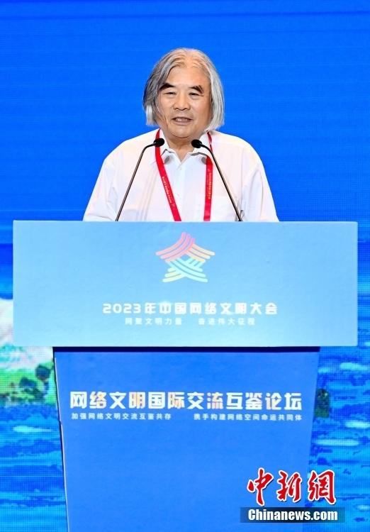 7月18日,2023年中國(guó)網(wǎng)絡(luò)文明大會(huì)網(wǎng)絡(luò)文明國(guó)際交流互鑒論壇在廈門舉辦。中外嘉賓圍繞加強(qiáng)網(wǎng)絡(luò)文明交流、互鑒、共存等話題展開探討。圖為光明日?qǐng)?bào)社原副總編輯、浙大城市學(xué)院文明與傳播研究院研究員沈衛(wèi)星作主題演講。中新社記者 王東明 攝