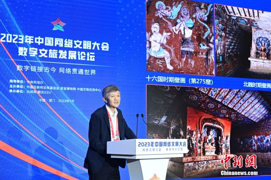 7月19日,2023年中國網絡文明大會數字文旅發(fā)展論壇在福建省廈門市舉辦。論壇以“數字鏈接古今 網絡貫通世界”為主題,邀請國內外數字化、文博考古、旅游等領域專家和代表共同探索古籍文物在數字時代的創(chuàng)造性轉化和創(chuàng)新性發(fā)展,以及在數字技術賦能下,文旅產業(yè)如何實現高質量發(fā)展。圖為論壇現場。中新社記者 田雨昊 攝